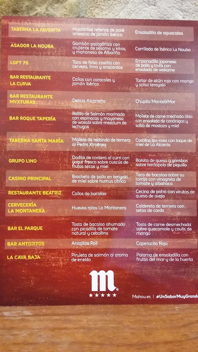 The menu features well-known favorites such as Torreznos and Patatas Bravas Mixtas, along with seafood highlights like Gambas Plancha and Calamares a la Andaluza. For those seeking more substantial fare, dishes like Solomillo de Cerdo or Chuletón de Buey offer satisfying portions without complexity.